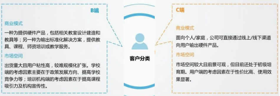 教育機(jī)器人的市場可分為TOB和TOC。其中在B端的主要客戶為學(xué)校和培訓(xùn)機(jī)構(gòu),主要提供機(jī)器人的產(chǎn)品、課程、培訓(xùn)等,由學(xué)校老師或機(jī)構(gòu)老師帶L學(xué)生學(xué)習(xí);在C端則是主要針對家庭場景陪伴和方便孩子學(xué)習(xí)。