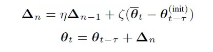 在基于 BMUF 的訓(xùn)練框架下,假設(shè)我們總共有 N 個(gè)并行工作機(jī),一個(gè)工作機(jī)可以是一塊或多塊 GPU 卡,也可以是一個(gè)計(jì)算節(jié)點(diǎn)。給定一個(gè)包含 Nτ 個(gè) minibatch 的訓(xùn)練數(shù)據(jù)子集,首先我們將這些數(shù)據(jù)均勻分布到 N 個(gè)并行工作機(jī),每臺(tái)工作機(jī)獲得 τ 個(gè) minibatch。從一個(gè)共同的初始模型 θ_(t-τ)^((init)) 開(kāi)始,N 個(gè)工作機(jī)獨(dú)立更新各自的局部模型 τ 步,得到 {θ_(t,1),θ_(t,2),…,θ_(t,N)},對(duì)局部模型取平均得到 θ ̅_t。這一過(guò)程稱(chēng)之為數(shù)據(jù)塊內(nèi)并行優(yōu)化(Intra-Block Parallel Optimization, IBPO)。與直接將 θ ̅_t 作為全局模型不同,BMUF 技術(shù)將歷史更新信息與當(dāng)前更新信息結(jié)合,得到全局模型: