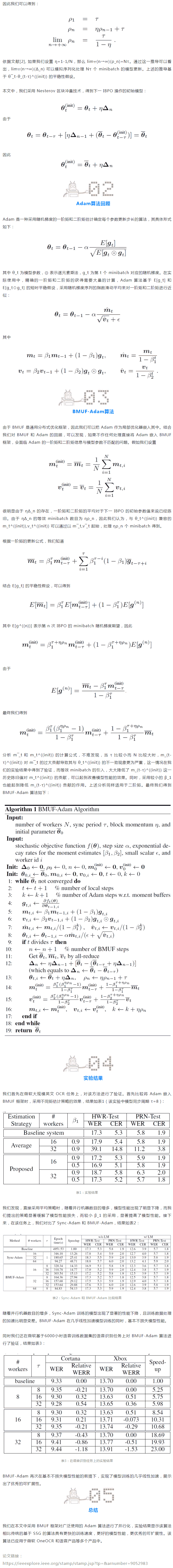 本文中,我們采用 BMUF 框架并行化 Adam 算法,并在微軟大規(guī)模 OCR 和語(yǔ)音產(chǎn)品數(shù)據(jù)集上進(jìn)行了測(cè)試。實(shí)驗(yàn)結(jié)果表明,在大規(guī)模 OCR 任務(wù)中,BMUF-Adam 在多達(dá)64機(jī)的并行訓(xùn)練中幾乎實(shí)現(xiàn)了線(xiàn)性加速的同時(shí),基本沒(méi)有模型性能損失,在32機(jī)大詞匯量連續(xù)語(yǔ)音識(shí)別任務(wù)中也獲得了類(lèi)似效果。