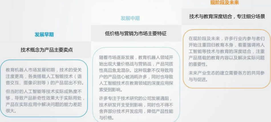 教育機(jī)器人經(jīng)歷了從概念先行到價(jià)格營銷到回歸內(nèi)容與價(jià)值本質(zhì)的發(fā)展階段變遷。