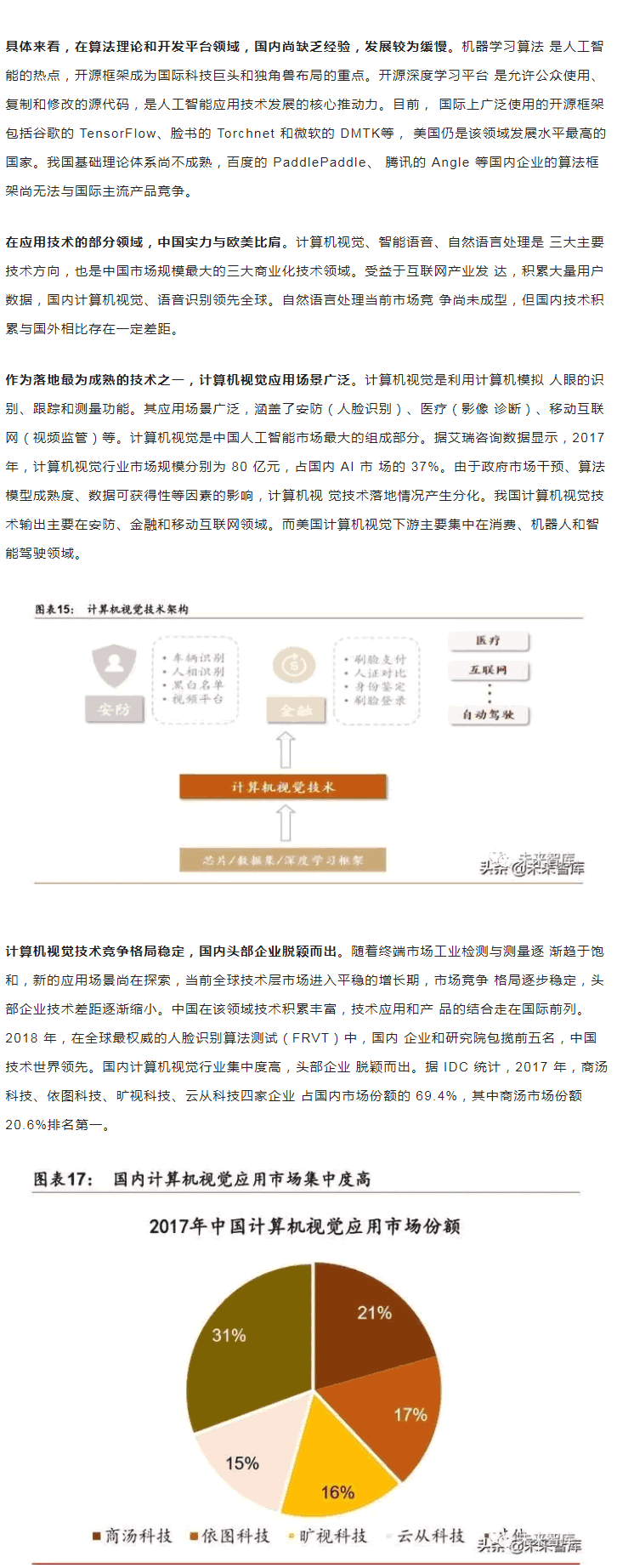 目前,人工智能產(chǎn)業(yè)的生態(tài)系統(tǒng)正逐步成型。依據(jù)產(chǎn)業(yè)鏈上下游關(guān)系,可以將人工智 能劃分為基礎(chǔ)支持層、中間技術(shù)層和下游應(yīng)用層;A(chǔ)層是人工智能產(chǎn)業(yè)的基礎(chǔ),主要提 供硬件(芯片和傳感器)及軟件(算法模型)等基礎(chǔ)能力;技術(shù)層是人工智能產(chǎn)業(yè)的核心, 以模擬人的智能相關(guān)特征為出發(fā)點(diǎn),將基礎(chǔ)能力轉(zhuǎn)化成人工智能技術(shù),如計(jì)算機(jī)視覺、智 能語音、自然語言處理等應(yīng)用算法研發(fā)。其中,技術(shù)層能力可以廣泛應(yīng)用到多個(gè)不同的應(yīng) 用L域;應(yīng)用層是人工智能產(chǎn)業(yè)的延伸,將技術(shù)應(yīng)用到具體行業(yè),涵蓋制造、交通、金融、 醫(yī)療等 18 個(gè)L域,其中醫(yī)療、交通、制造等L域的人工智能應(yīng)用開發(fā)受到廣泛關(guān)注。