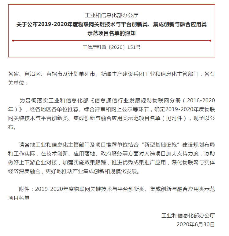 2020年度物聯(lián)網(wǎng)集成創(chuàng)新與融合應(yīng)用類示范項(xiàng)目名單
