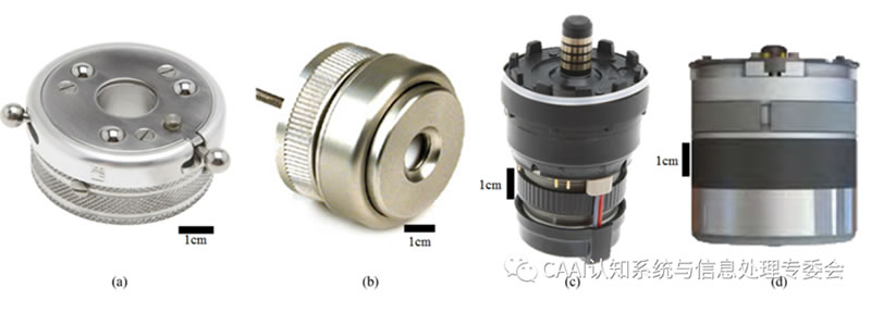 主動單自由度腕部通常在假肢和機器人應(yīng)用中都能找到。在假肢L域,這些系統(tǒng)通常與EMG系統(tǒng)一起使用,使用戶能夠通過肌肉信號控制旋轉(zhuǎn);顒邮滞罂梢允仟毩⒌膯卧傻郊偈种,或者集成到較大假手中的前臂中。與被動手腕類似,主動單自由度裝置也可分為旋轉(zhuǎn)器和屈肌。主動旋轉(zhuǎn)器是腕部假體中常見的動力裝置。獨立設(shè)備包括運動控制電動旋轉(zhuǎn)器和OB腕部旋轉(zhuǎn)器,如圖(c)所示,這兩種設(shè)備都是為與許多終端設(shè)備兼容而設(shè)計的,因而得到了相對廣泛的應(yīng)用。OB-Michelangelo手和TBi-Limb Quantum都使用緊湊的旋轉(zhuǎn)器,即軸旋轉(zhuǎn)和俯臥旋轉(zhuǎn)[圖(d)],它們分別安裝在各自手的假體窩和下手掌中,主動屈肌也往往納入現(xiàn)有的機器人手或終端設(shè)備系統(tǒng)。